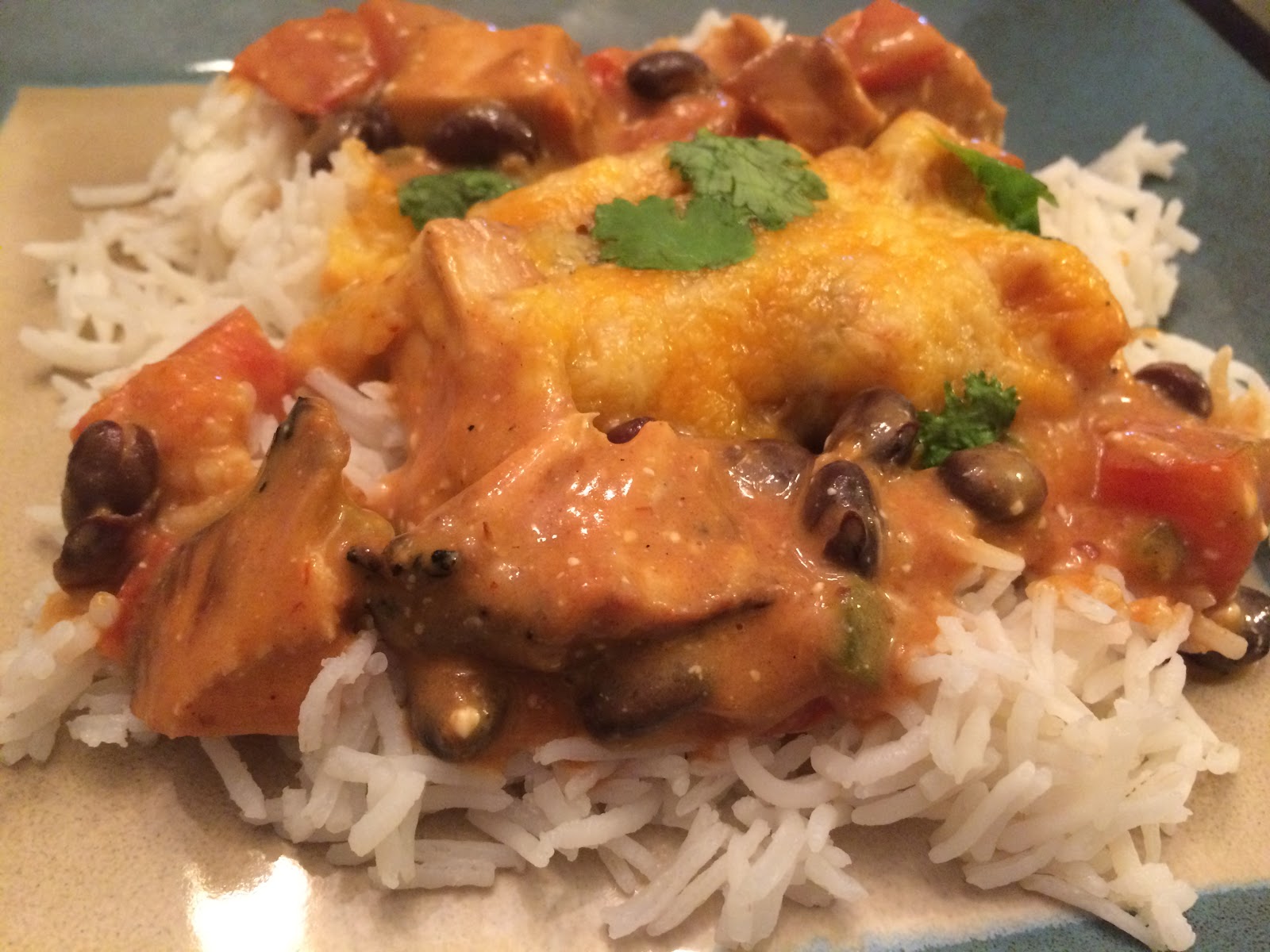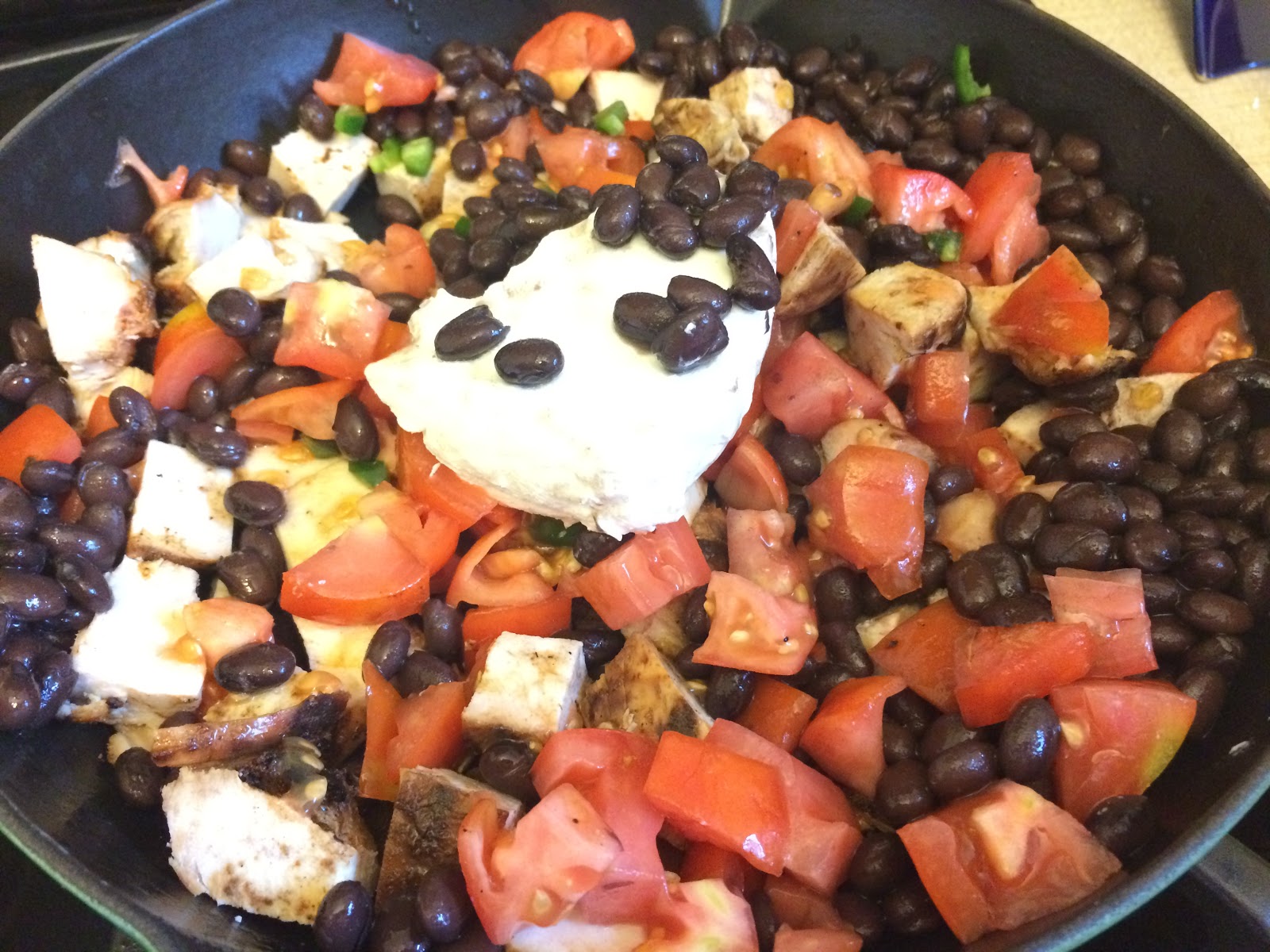 Sometimes you just need some easy and delicious comfort food. I had made something similar to this before, but I needed to use some particular ingredients. I had grilled some chicken the night before and had a lot leftover. I also had tomatoes and jalapeños from the CSA that I had to use. Looking for easy, I decided on a skillet dish served over rice for a “naked burrito” type dinner that was simple yet tasty. It’s not quite one-pot cooking, because I did make rice separately…but still, easy cleanup!