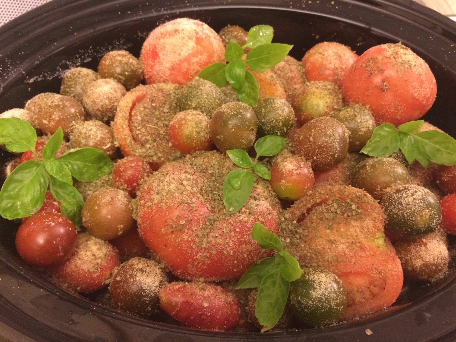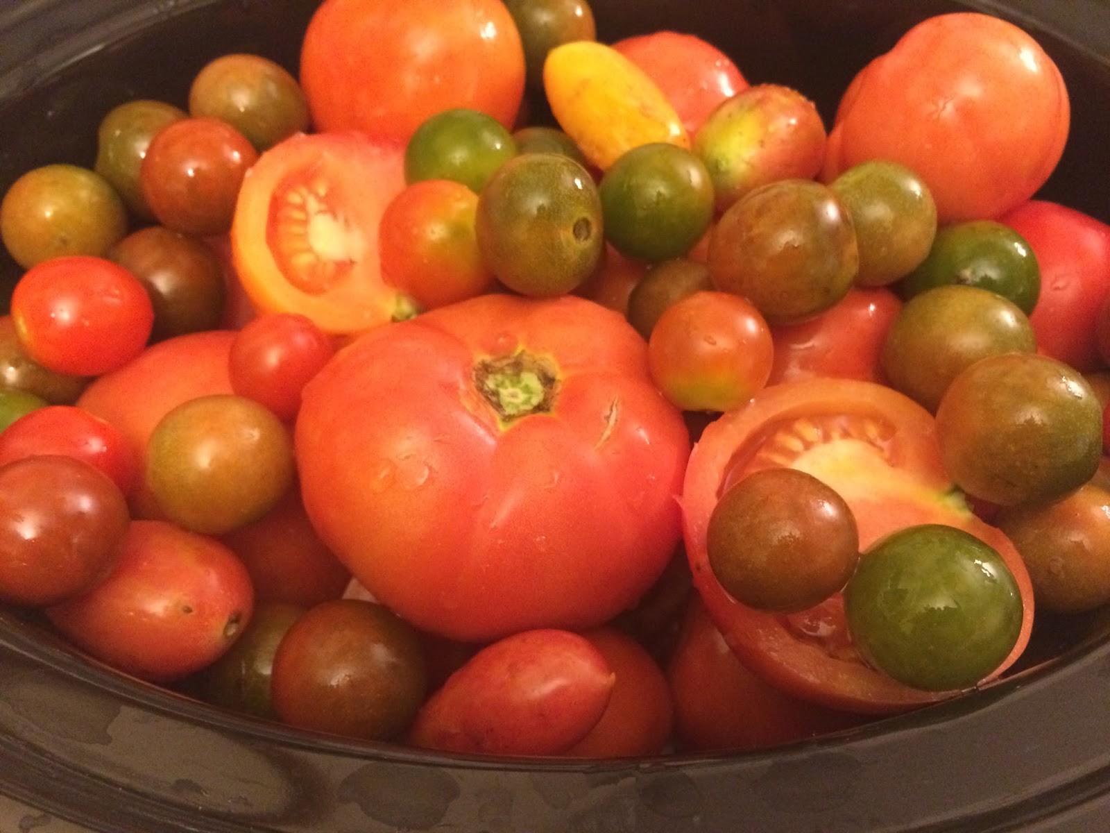 - Enough tomatoes to fill a Crock Pot — I used multiple varieties, including large and small heirloom, as well some cherry tomatoes