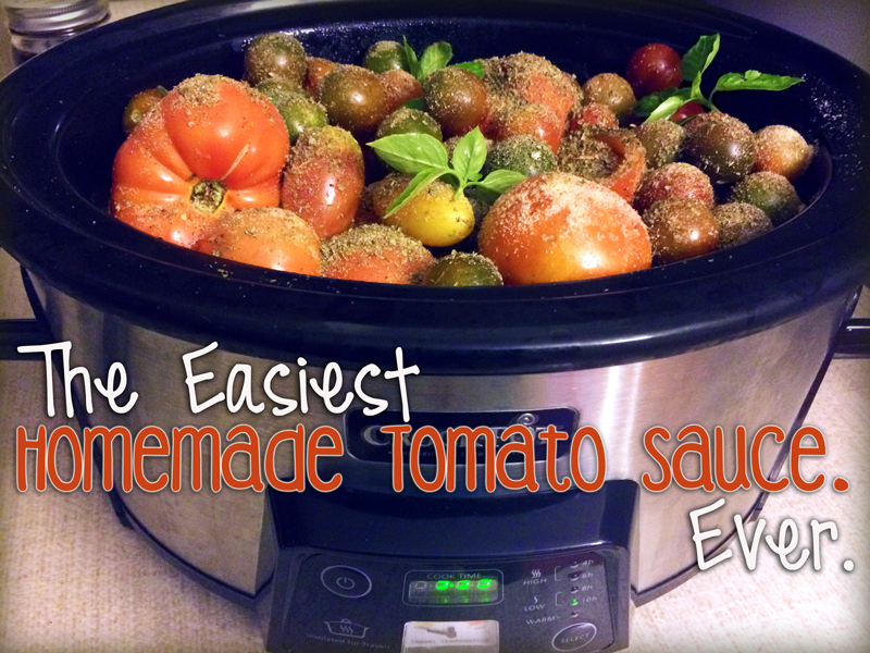 There’s really only one reason I always hope for extra tomatoes in my garden. Okay, make that two. One is salsa. Two is homemade tomato sauce. I don’t usually have much of a bumper crop, so I’ve only tried the tomato sauce thing once or twice before. This year, between my garden and our CSA, I did have an overabundance of tomatoes, and I was on a mission. You see, I wanted to make homemade tomato sauce that I could use in lasagna and spaghetti and other Italian dishes, but I wanted it to be simple. The recipes I had tried before involved boiling the tomatoes in hot water, followed by a cold water bath so you could remove the skins, and then removal of the seeds…just to then put it all back on the stove to cook for an extended period of time, only to end up with water, soupy sauce, unless I added extra tomato paste. Whew. After some thought and some research, I began to wonder about using my Crock Pot and immersion blender to make tomato sauce, without peeling and de-seeding. I figured if I blended it up, I wouldn’t care if the tomato skins were in there, and I don’t notice any off-flavor from the seeds. The results of the experiment were delicious, and the method was unbeatably simple!