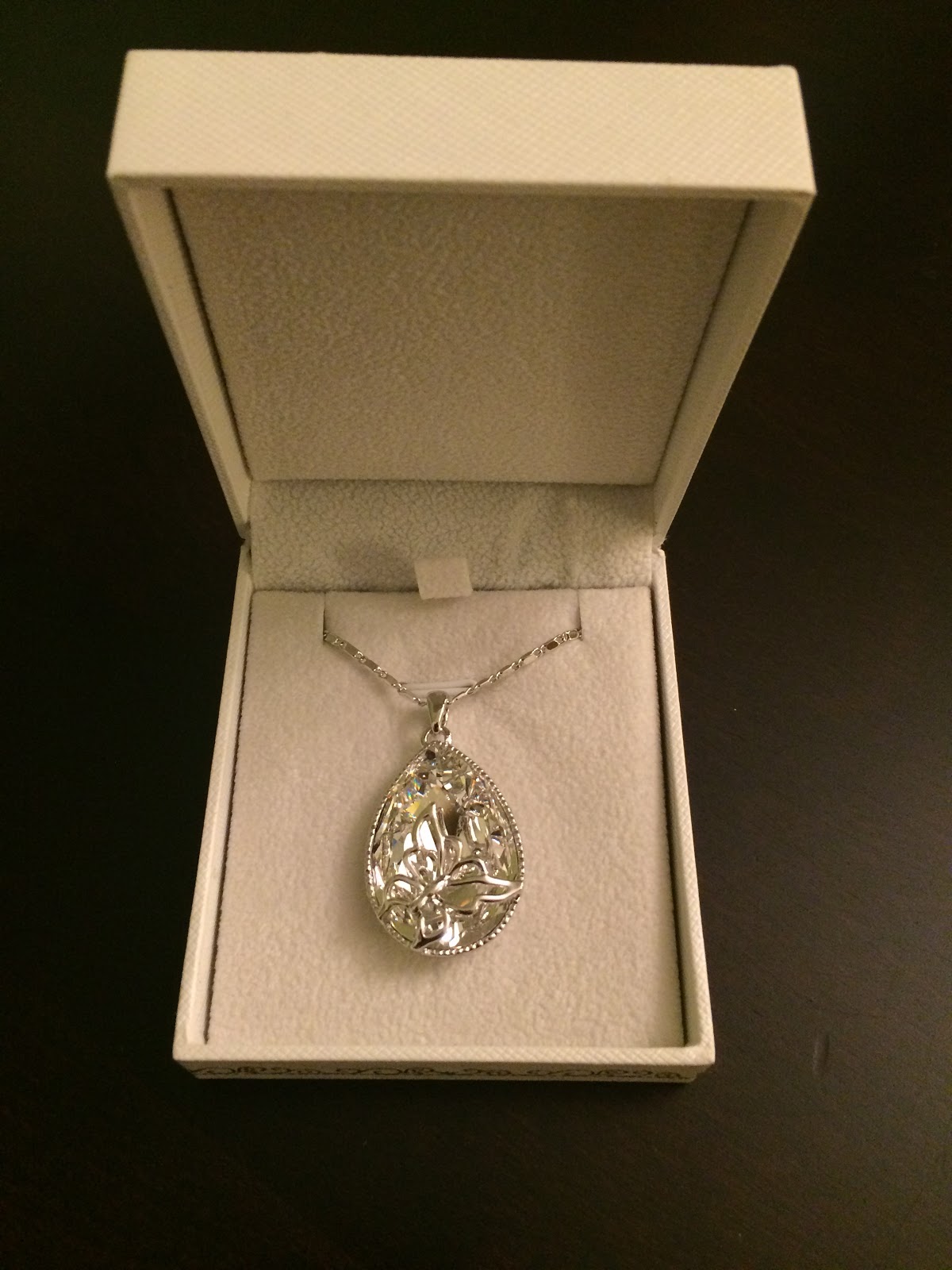 The pendant arrived in a nice jewelry box and had a protective backing on it. When I opened the box, it was just as sparkly and lovely as the pictures! I tried it on with a more casual outfit first — it actually went really well with the the spangly jeans I have.