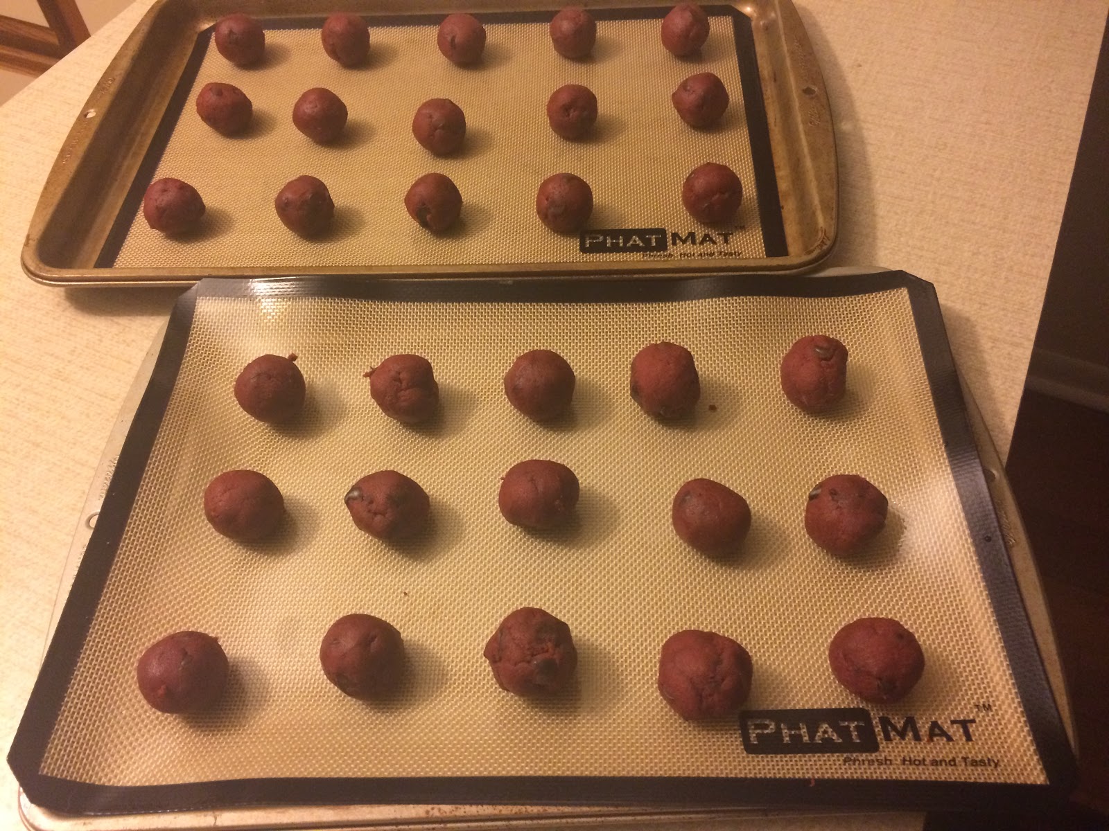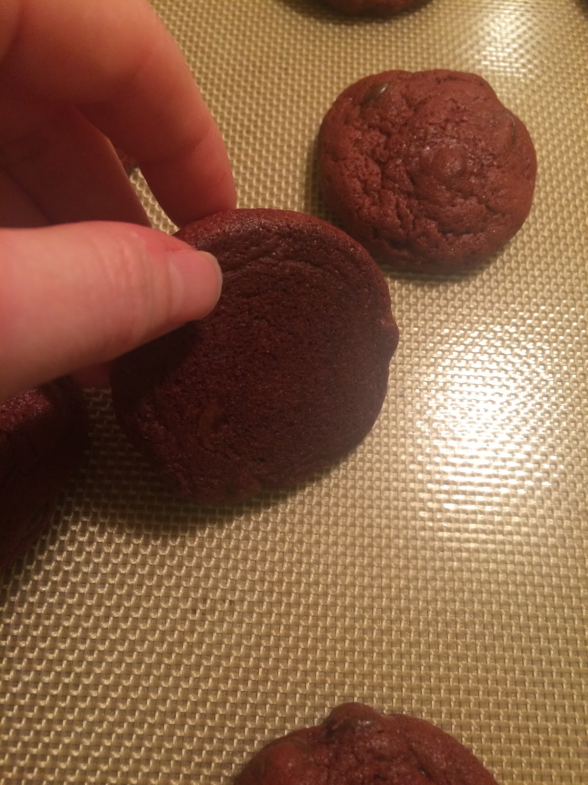 I tried out the baking mats tonight while I made these (amazing) Red Velvet Chocolate Chip Cookies from Sally’s Baking Addiction. I must say, I am truly impressed with these baking mats. They are about the size of a half sheet pan, but worked okay on my slightly smaller cookie sheet, too. It truly is a no-mess way to bake.