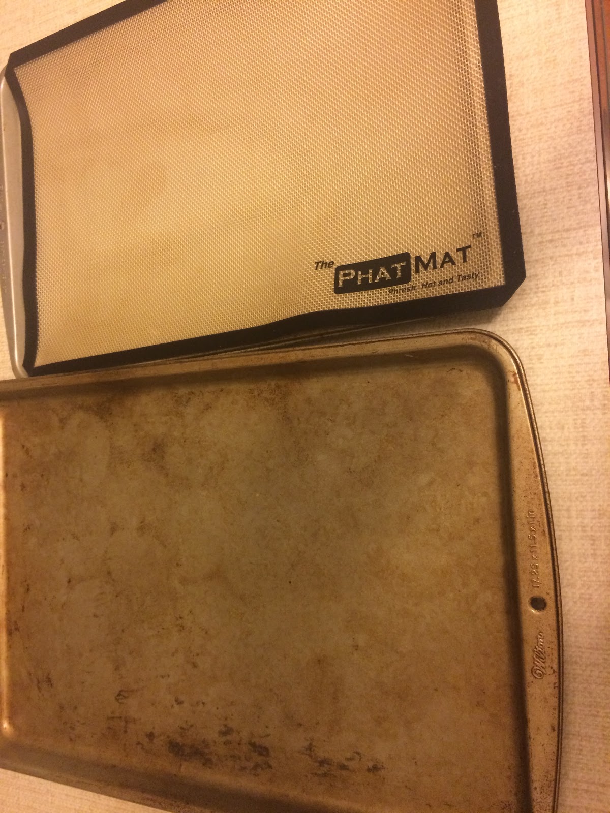 The other thing I like about the PhatMat is that it helps keep your cooking sheets from getting gross. You know what I mean? Eventually, mine always tarnish or get something baked on that just will not come off — to the point that they look nasty and I have to kind of wonder about baking on them.