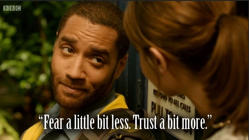 Now, this gives us a couple of practical things to “do”. I’m someone who is prone to worry and anxiety, and I often need the gentle reminder from my husband that that reaction to a situation does not reveal trust in God. In many ways fear really is the antithesis of trust, isn’t it? I was reminded of this during — you guessed it — a Doctor Who episode where Danny Pink said it simply: “Fear a little bit less. Trust a bit more.”