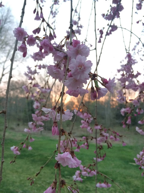 A close-up of a weeping cherry branch at sunset.