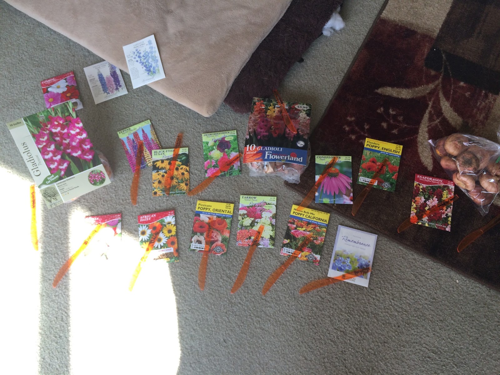 The new garden area is a big space, so rather than buying other plants to supplement, to fill in the area more economically, I decided to buy some seeds — perennials and reseeding annuals. The only problem was that all of the flowers looked so pretty…I may have gotten a bit carried away with my purchases! I sowed most of them last weekend. And yes, I labeled all of my seed plantings with orange plastic knives. Classy, I know.