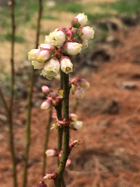 There are already clusters of little white flowers on many of the blueberry bushes.