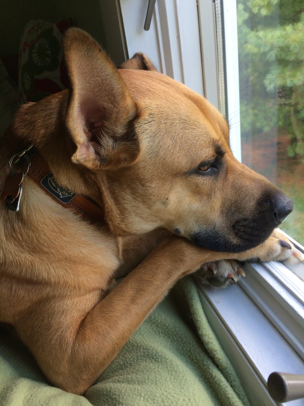 | Happy looking wistfully out the window wishing he could have a friend over to play. |