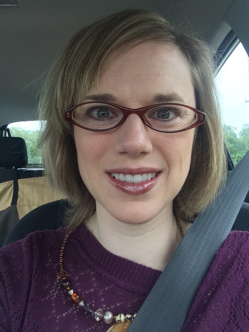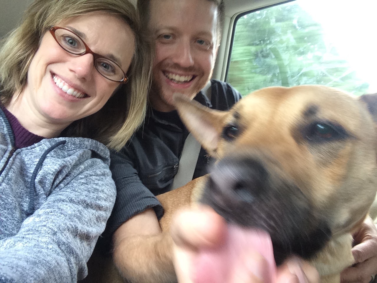 Tom told me I look like a librarian with these glasses. I’m still not quite sure whether that’s a good thing or not…but I like them! And, check out this bonus photo testing out my new glasses tonight while passenger — in the backseat of my friend’s car, along with my husband and dog (who appears to be sticking out his tongue for my husband to hold?).