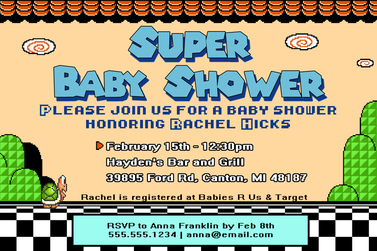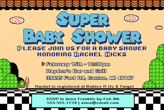 Interestingly enough, the most popular Pinterest content that is from my blog comes from my post on the Super Mario Bros. themed baby shower my mom and I threw for my sister-in-law — and the related gifts for my nephew. I was contacted recently about where I got the invites, and decided I should post some more helpful links if you’d like to create your own. Here’s a look at the invitation design: