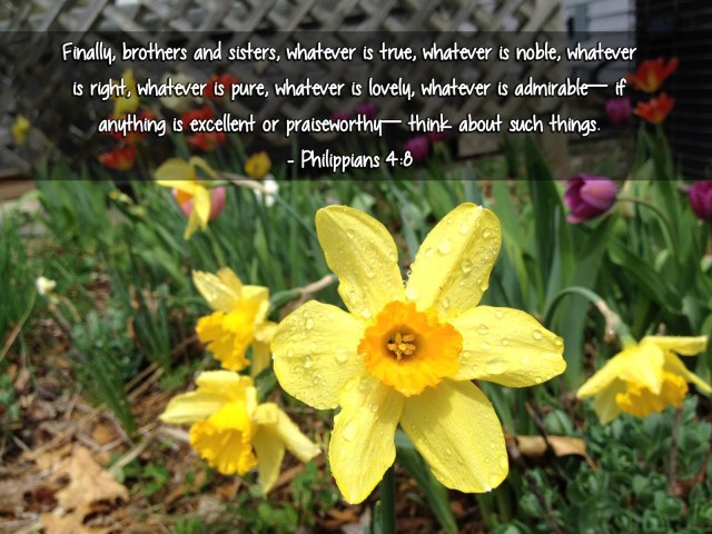 “Finally, brothers and sisters, whatever is true, whatever is noble, whatever is right, whatever is pure, whatever is lovely, whatever is admirable—if anything is excellent or praiseworthy—think about such things.” -Philippians 4:6