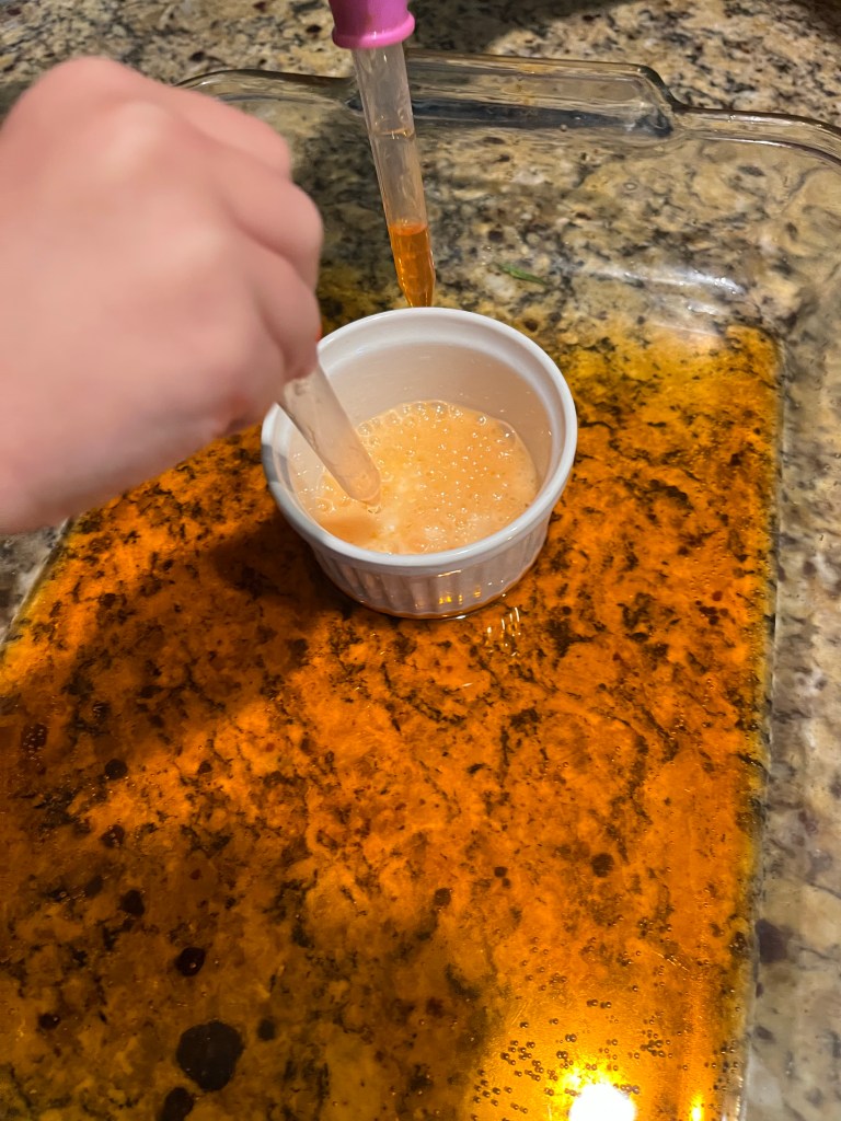 We did the first pumpkin bag with clear white distilled vinegar. After it popped and we had fizzy vinegar all in our baking dish, I spotted our sensory, fine motor and color learning opportunity! I quick grabbed some pipettes and food coloring and had the kids watch and mix as we put red and yellow in our vinegar to turn it orange. Then we added a bit more baking soda to a small ramekin that they could add vinegar to with the pipettes and watch it fizz. That’s when I realized we should have made our pumpkin with orange vinegar so that’s what we did for exploding pumpkins number two!